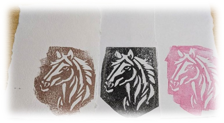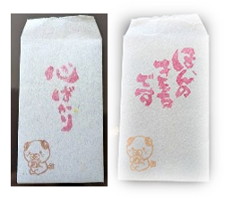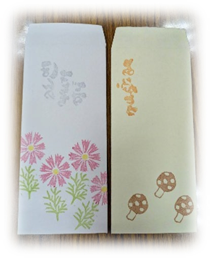 牛乳パックを再生して作った封筒とハガキには手作りのハンコを押しています。